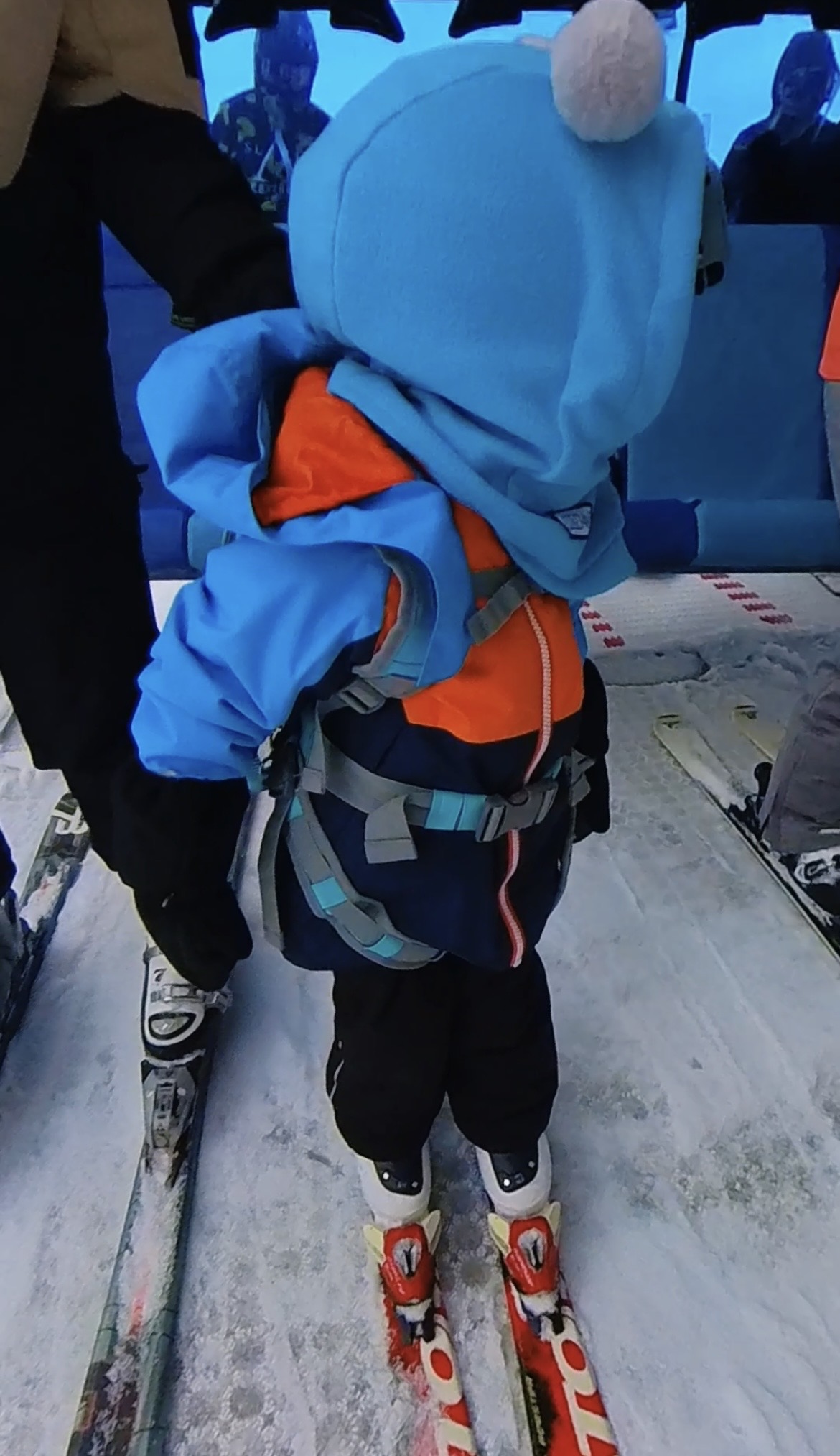 Meillä on kokemusta tuolihissin käytöstä lasten kanssa monella tapaa, mutta liputan vahvasti tässäkin MDXONE valjasrepun käyttöön. Repussa on ylhäällä käsikahva aikuiselle, josta lasta voi nostaa ylös ja kannatella rinteessä. Ja koska repussa on jalkojen välistä tulevat valjaat niin se pysyy tukevasti lapsen päällä, vaikka siitä nostaisi. Tästä käsikahvasta samalla lasta vartalosta tukien, hänet on äärimmäisen helppo nostaa viereen tuolihissin saapuessa. Toinen hyvä vaihtoehto on nostaa lapsi ylös kainaloon valmiiksi ennen hissin tuloa, mutta kaikkien lasketteluvälineiden kanssa tämä on hyvin raskasta. Lapsen saa repusta avustettua hissiin vaivattomasti, oli hänellä sitten sukset tai lauta jalassa. Tein hiljattain tuolihissiinmenosta myös reelsin Instagramiini. Löydät sen täältä.